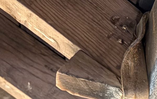 That’s a late 1800s industrial building, looking up at the underside of an upper floor. The first thing that needs to be said has nothing to do with the point of this post: the joists are about twice as deep as they look like here. If you look closely, you can see the ledger strips that are nailed to the sides of the joists to support the flooring between the joists. Usually you see this detail when the floor has been deafened either to (as the name implies) reduce sound transmission or to make the floor better able to carry tile finish.
