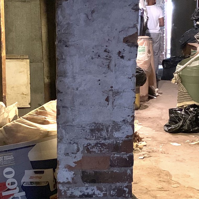 That odd photo is a brick pier in the cellar of an uptown brownstone. There’s some water damage at the base from rising damp, but otherwise no reason it couldn’t perform its structural role. The line of piers and girders in the cellar is below the stairhall partition on the floors above, which is an interior wood-framed bearing wall that cuts the floor joist span from 20 feet down to about 14 feet.