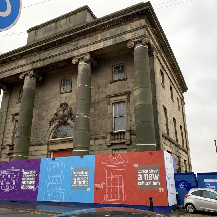 That very nice example of Neo-classic architecture is the headhouse of the old Curzon Street station in Birmingham. It was in railroad use for 128 years starting in 1838, and it wouldn’t surprise me if that was some kind of record for longevity among railroad buildings. Originally, it was the front of a dead-end station that had tracks under an open iron shed. After 1893, it was converted to freight use – and that made it one of the fancier freight around – and then it was finally closed for train use in 1966.