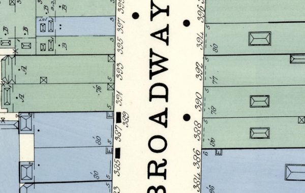 In the second photo, there’s a construction site in the left foreground, on the south side of Fulton Street. It’s got a frame of cast-iron columns and steel beams: you can actually see into the hollow space at the top of the square-section corner column. The spandrel beams – the ones at the edge of the building – are set back, so that they connect the inside faces of the columns inboard of the masonry wall. This won’t be a skeleton-frame building when it’s complete, because the frame doesn’t support the walls: it’s a cage frame, a hybrid of frame and bearing wall. And if that sounds vaguely interesting, wait until The Structure of Skyscrapers comes out.