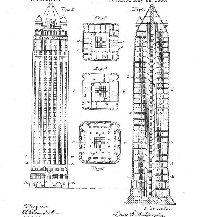 The first skeleton-frame buildings (with a frame supporting all loads) in the United States were constructed in 1890; the first cage-frame buildings (with a frame supporting all loads except for the exterior walls) were constructed about five years earlier. The picture above, from Leroy Buffington’s 1888 patent, represents a weird side-alley/dead-end in the history of frame development. I wouldn’t ordinarily take up space for an idea that was never built and may not have been buildable, except that there have been serious histories of design and construction that felt this patent was worth mentioning.
