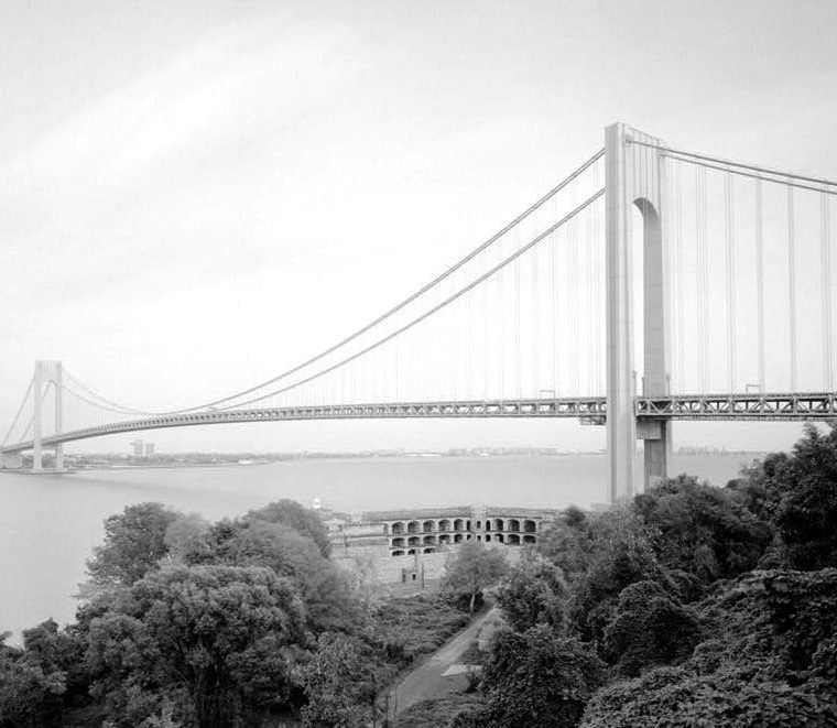 The full title of the picture above is “Staten Island Tower Of The Verrazano-Narrows Bridge, Fort Wadsworth In Foreground”, which is reasonably unsubtle, and part of a HAER survey called “Verrazano-Narrows Bridge, Spanning Narrows between Fort Hamilton (Brooklyn) & Fort Washington (Staten Island), Brooklyn, Kings County, NY” which is even less subtle. (Just to drive poor spellers crazy, the name of the man Verrazzano is typically spelled with two zs while the bridge is sometimes spelled with two and sometimes spelled with one.)
