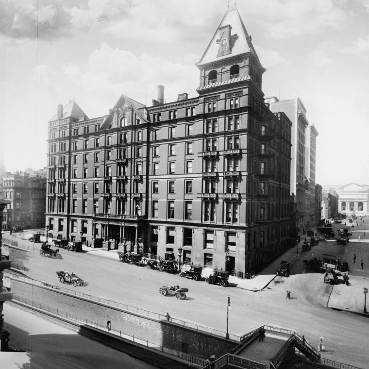 First, the Library of Congress says that the photo is dated between 1900 and 1910, but it’s almost certainly later: on the far right, off in the distance, we can see the classical New York Public Library, which wasn’t complete on the outside until 1906. The date is later than that: the tall building on the right, on the south side of 41st Street and separated from the hotel by two rowhouses, is the Chemists’ Club, which was completed in 1911. A building’s exterior can be complete while the interior is still in construction, but the club puts this photo as no earlier than 1910.