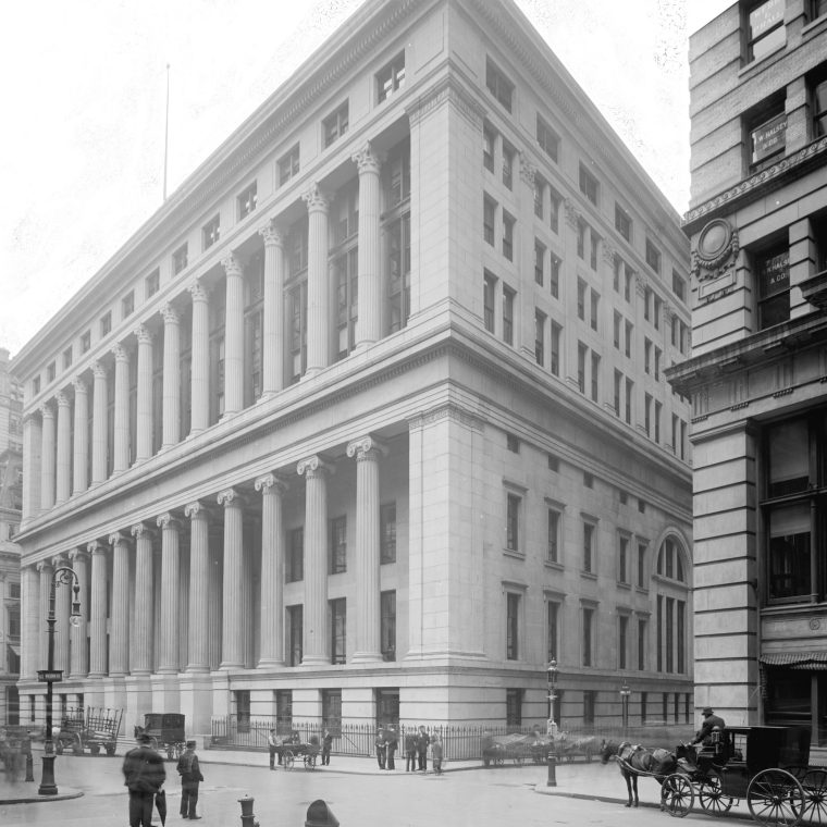 55 Wall Street is an impressive building and always has been. It was constructed, between 1836 and 1842, in the days when masonry construction had to pause for cold weather, as the Merchants Exchange. The start date gives a hint as to what happened: the old Merchants Exchange burned in the Great Fire of 1835. The replacement was built with all-masonry construction, meaning masonry vaulted floors, to be fireproof. It also briefly housed the New York Stock Exchange and was converted in 1862 to the New York Customs House. Work on a new Customs House at Bowling Green started shortly after 1900 and was completed in 1907; the National City Bank (before twentieth-century branding converted it to CitiBank) had bought the building in 1899 but didn’t move in until 1908.