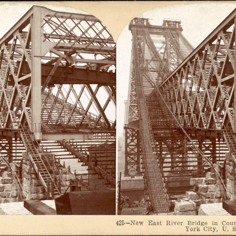 This 1901 stereoscopic view of the Williamsburg Bridge under construction is, in engineering terms, nothing that special. The cable work was long since completed, the main trusses were almost done, and the framing for the two decks was in progress. This picture is far less dramatic than the one I posted this spring, where the main span was still in the works. My opinion of the bridge hasn’t changed since then: it’s easily the ugliest major bridge in a city full of good-looking bridges. But that photo…