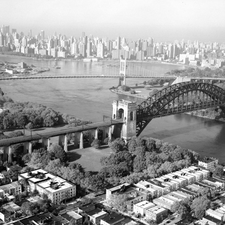 Time to revisit some details I omitted in an early blog post. This spring, I talked a bit about the construction sequencing of the Hell Gate Bridge, following up on some pictures I took while crossing it two summers ago. It seems that I haven’t exhausted the topic. The picture above, part of the HAER survey, is a good one: it shows the heavy steel of the bridge, the houses and small apartment buildings of Queens in the foreground, the Queens leg of the Triboro Bridge in the mid-ground, and the midtown-Manhattan skyscraper farm off in the distance.