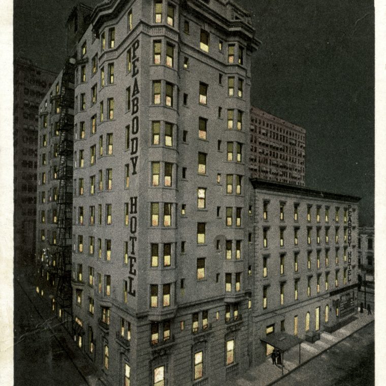 The Peabody as a business has been around since the 1860s; the current building was completed in 1925. It’s a steel-framed skyscraper, but for the 1920s on the short side. It’s actually quite similar, physically, to the skyscrapers in yesterday’s 1906 view of Memphis, but of course the skyscraper world had moved on in the intervening 19 years.