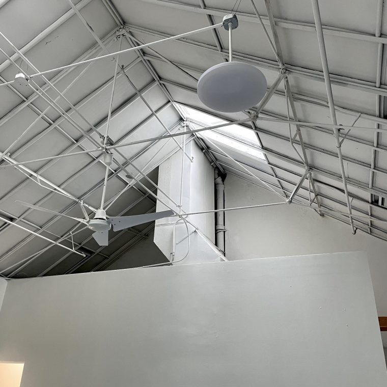 Most of the trusses I’ve talked about are large and carrying heavy loads. There’s nothing that says you can’t use a truss for a 20-foot span and ordinary roof loads, which leads you to the photo above, from an old loft building in Brooklyn. The truss members are mostly bars that are, within an engineering approximation, the same size as the electrical conduit for the lights and fan. (The truss bars are actually slightly smaller, but who’s counting?) I know it can be hard for people not used to looking at this kind of structure, so here’s an annotated version highlighting one truss: