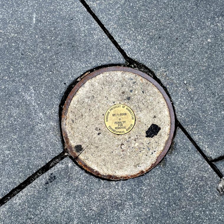 As mentioned when I started on this topic, the visible marker is attached to some kind of substructure to make sure it’s fixed in place. Sometimes that substructure is effectively a very large nail. Sometimes, as appears to be true here, it’s a concrete-filled pipe. The edge of the pipe and the top of the concrete make a nice contrast to the fancy sidewalk paving here.