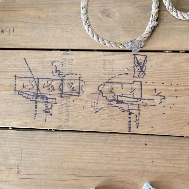 A drawing in sharpie on the scaffold plank, explaining the problem with removing the balustrade sitting on top of a counterweighted masonry cornice. It’s likely that the mason or rigger who drew that never took a physics class; it’s also likely that they understand statics better than many people who have.