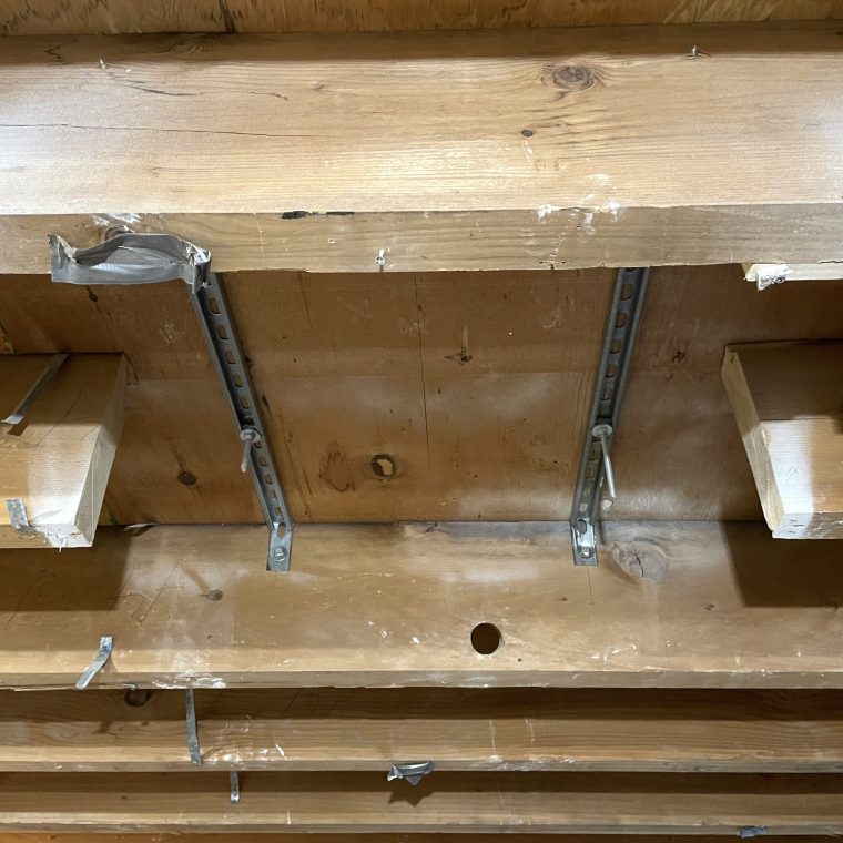 The picture above shows some very nice wood joists in a 1920s rowhouse, as exposed at the beginning of a project after plaster demolition. I don’t know what was installed there – maybe a light fixture, maybe a small air-handler, maybe something else – but whoever installed it carefully cut a joist in two and left it like that. They also drilled a hole at the bottom of the next joist over, well below the recommended portion of the joist for drilling holes. They also cut one of the two joists that serve as a trimmer.