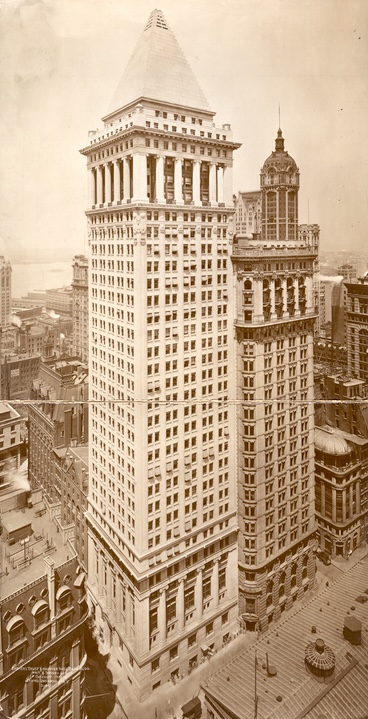 Above, Bankers Trust as it looked, completed, in 1912. (If you’re a fan of the stepped-pyramid crown and really bad movies, I suggest watching Q – The Winged Serpent. If you are not a fan of really bad movies, do not.) The construction photo album, after lovingly capturing the demolition of the previous buildings and foundation work in great detail, breezes through construction of the new building. Here are the tops of the cellar columns barely sticking up over the support of excavation bracing: