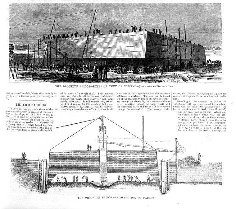 Following up on part 1 and part 2, I want to talk about how the caissons of the Brooklyn Bridge were built, installed, and used. Unlike the 1883 image from part 1 (below), the image above is from 1870, while the work was still going on. I’ve played with the contrast to make the drawings clearer, which had the effect of making the text less clear.