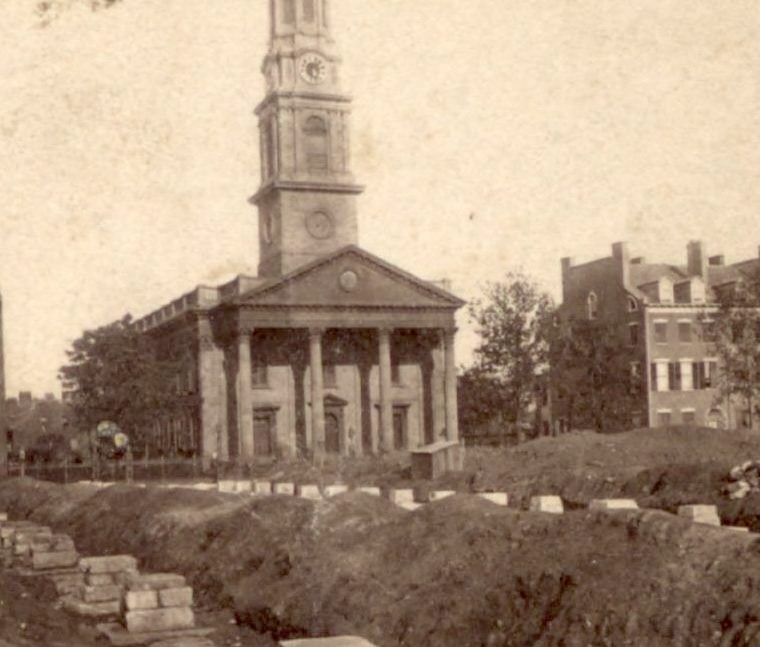 Take another look at the picture above, which is from 1867. The photographer was standing in the park, facing east to the church, and a series of trenches had recently been dug into the ground, with stone piers built in each trench. Those piers are the foundations of the freight terminal. We’re seeing the moment when the park disappeared. Here’s a roughly similar view in 1890, with the freight terminal – complete with a statue of Cornelius Vanderbilt in the pediment – and the site of the church behind.