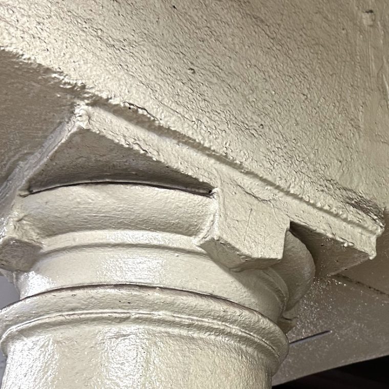 The load path is that the roof over the platform and over the tracks rests on the platform edge beam, which is supported by the short cantilevered end of the girder, which is supported by the column. You can see that the girder extends out to the far (track) side of the edge beam, so the edge beam is not continuous and has a steel-to-steel connection to the girder. Then the girder sits on the column. Note that we don’t see any vertical-axis bolts to connect the bottom flanges of the girder to the column top, but a common detail with cast iron columns was a “pintle” – a narrow vertical extension cast with the main column – extending up from a column top. If there’s a pintle here between the two pieces of steel that make up the girder, we wouldn’t see any bolts because they’d be buried in the concrete encasement.