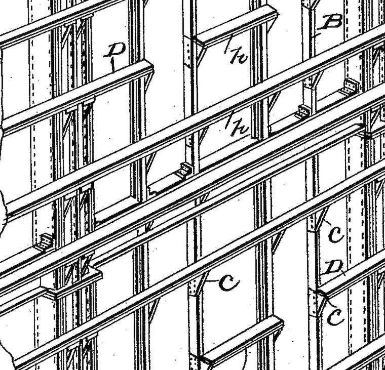The columns look like what we’d expect for a skeleton-frame building, and the spandrel beams are more or less what what we’d expect. The striking thing about this drawing is the presence of shelf angles for almost every separate course of (relatively-thin) veneer masonry, supported on structural-steel studs that run spandrel beam to spandrel beam. Pelton’s description – again, written in 1892, when the oldest skeleton-frame high-rises were two years old – is fascinating: “My invention relates to that modern construction of buildings in which a steel or iron frame is inclosed in a brick or other wall or casing, so as to form a composite structure having great strength, by reason of which it can be carried up to great heights. In this class of buildings the element of strength is contained in the steel or iron frame, while the outer wall or casing merely furnishes an inclosure and provides facilities for an architectural design and ornamentation. The object of my invention is to provide an inclosure for such buildings that will materially reduce the thickness of the walls, and at the same time be equally as serviceable and substantial as walls of greater thickness, while the expense of construction will be measurably reduced.” That’s a great statement about the idea behind skeleton framing and the logical next step for designers to take: once you’ve removed the structural function from the exterior walls, leaving only enclosure, do you really need or want the huge mass of undifferentiated masonry that made up the walls of that era?