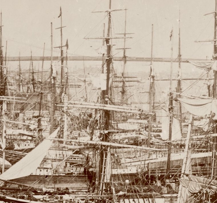 From the 1880s, a view of South Street and the East River with the brand-new Brooklyn Bridge in the background. The bridge was the first suspension bridge with steel wires in its main cables. Steel rope had been used in ships for some time, but these sailing ships were mostly rigged with hemp rope. So we’ve got the two ends of a spectrum for a specific technology in one photo: a very old technique and one that was new then.