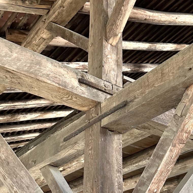 That’s roof framing at the Hopewell Furnace, an early-1800s ironworks in Pennsylvania. (Note that this is a reconstruction from the 1960s, but one that to my knowledge closely follows the original.) The rafters are just crudely-trimmed logs, but the three-dimensional complexity of the girders and bracing is impressive. I can’t wait to start documenting that.