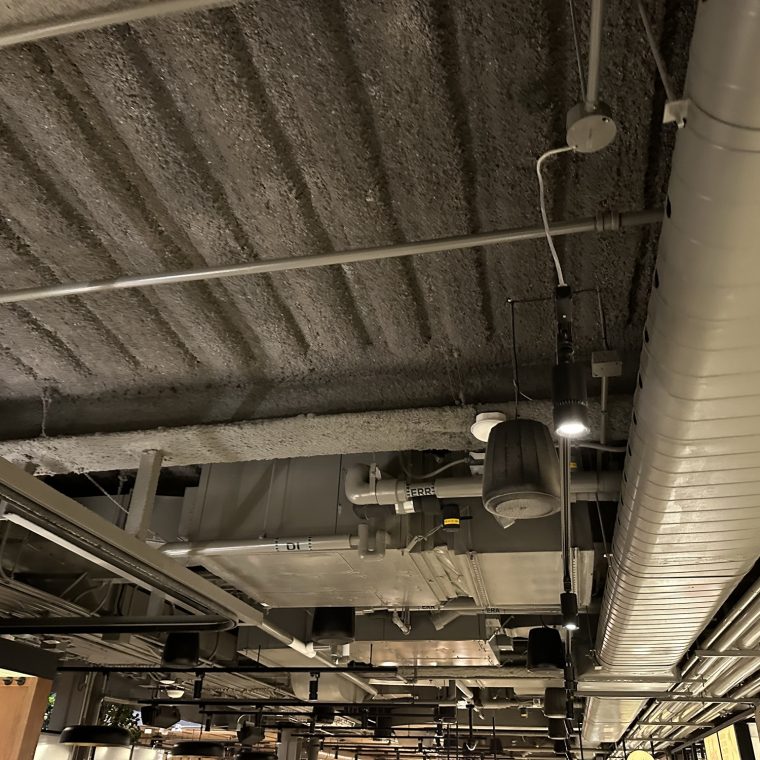 Structural steel and composite steel deck used with concrete slabs need to be fireproofed. Ducts, pipes, lights, and electrical conduits do not.