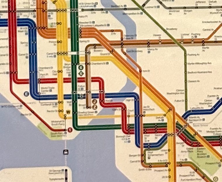 - No New York subway map has ever been remotely accurate as a map of the city. They all have distorted the geography in various ways, most consistently by making Manhattan appear much bigger than it is compared to the other boroughs. The reason for the distortion is simple: every train line and every station requires some amount of labelling, and there’s a minimum size text that can be used and still have the thing be legible. So the areas with more lines get bigger to provide room for the labels, and the areas with no subway service shrink. The result is a distortion that New Yorkers barely notice any more because every subway map has had this distortion in a similar way.