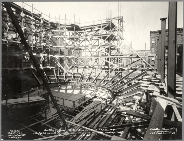 The building under construction is the Mother African Methodist Episcopal Zion Church, also known as the Mother Zion Church. The congregation dates back to the eighteenth century, and this building has now been its home for the past century. From the outside it looks like a fairly traditional masonry church, but as the photo above shows, it’s actually a modern steel-framed building. A good place to start is the annotation at the bottom of the photo. On the left, the date and the Wurts Brothers’ name. In the center, “Mother of [sic] Zion M. E. Church, West 137th St. N.Y.C. / Scaffold inside auditorium. From S.E. Corner looking N.W.” followed by the date and time. On the right, “Miller-Reed Co. / – Builders – / 103 Park Avenue. N.Y.C.”