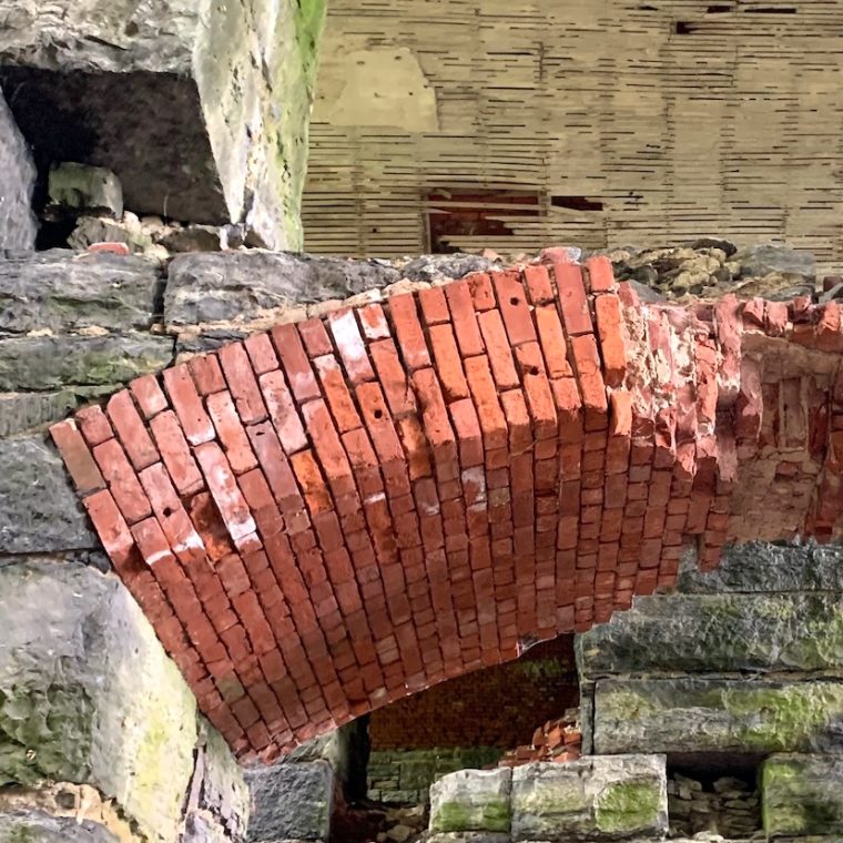 So the arch was, in terms of gravity, carrying its own weight and the weight of the stone above, and that stone is now gone. As bad as the arch is, it can carry it’s own weight, which is provable by looking at it: if it couldn’t, it would collapse. If left alone, there will be continued small-scale material failures – for example, continued mortar loss will lead to more bricks dropping out – until that triggers an overall arch failure because there will no longer be a viable load path. Hopefully the project that we are involved with will improve conditions before any of that happens.