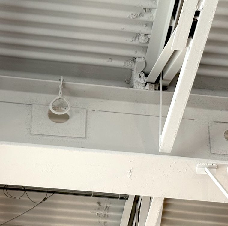 This is a modern one-story building, apparently built with the taller commercial building next door. So we’re looking at the underside of the roof, with some of the architectural elements (the track lights, the exit sign, the duct grilles) defining a virtual ceiling plane. There is nothing to suggest that there are any problems with the roof’s structural or waterproofing performance; I’m going to assume that Providence’s winters mean there’s a layer of insulation on top of the metal deck.