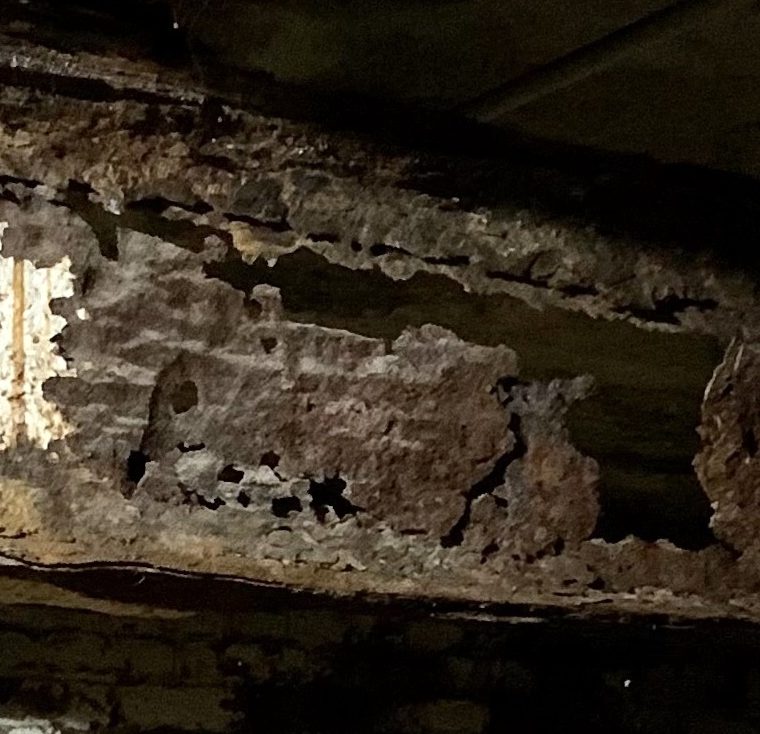 A is some white paint (almost certainly lead-based) on the beam web. B is a big hole where the web has rusted away completely. C is what’s left of the bottom flange after a lot of delamination and other material loss. D is what’s left of the top flange, ditto.