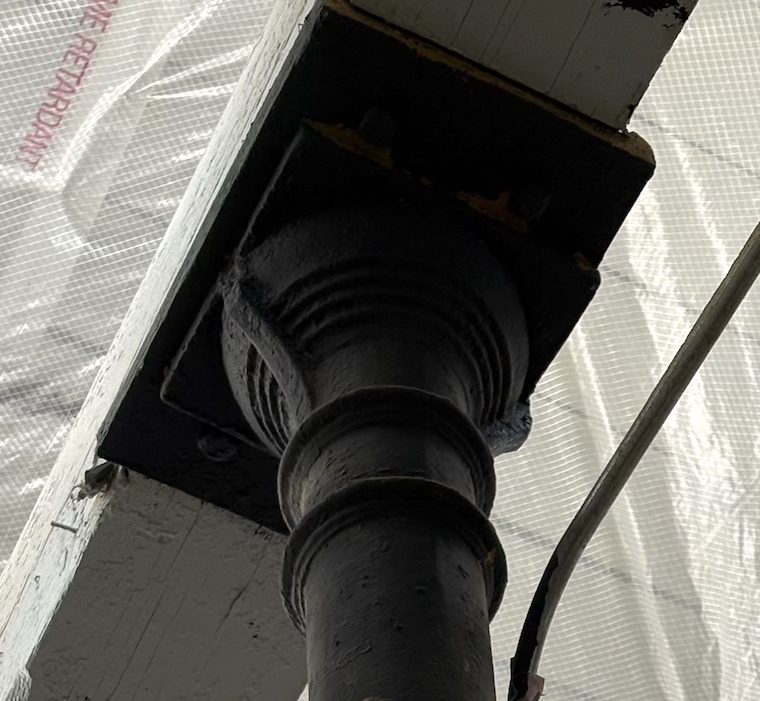 In any case, that’s a column with a diameter of roughly five inches that’s more than twelve feet high. Slender by any circumstances, but particularly so for cast iron. There are several obvious indicators that it’s cast iron and not a wrought-iron or steel pipe, starting with the fact that it’s not cylindrical. There’s a definite taper from the top to the bottom, as well as maybe (hard to tell by eye) a little bit of entasis. Then there’s the fact that the capital and top connection are integral with the column shaft, as well as what appears top be a pair of unused connections a bit below the capital: