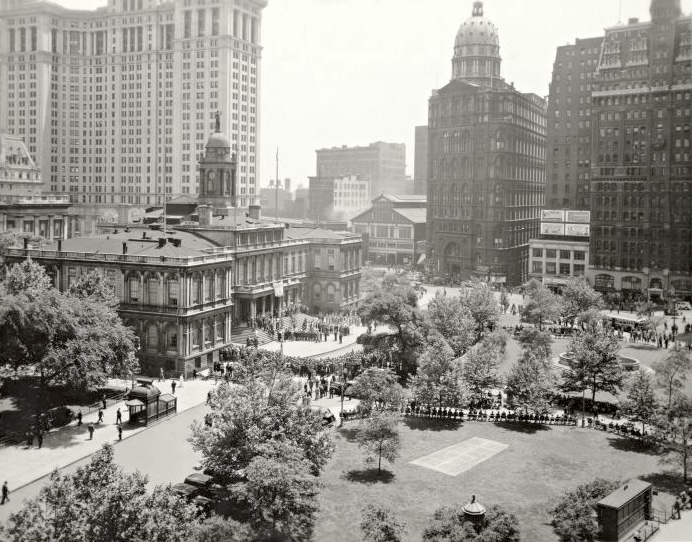 City Hall is a real park in the sense that the Department of Parks and Recreation is involved with it, and there’s grass and trees. But realistically, it’s an open space with some buildings in it – and there used to be a lot more buildings in it, with the number gradually decreasing through the twentieth century to the two that are there today (City Hall and the Tweed County House) – and the grass is pretty much unused for active play or inactive sunbathing. This picture must have been taken on a nice day, as it looks like every possible place to sit on a bench is taken.