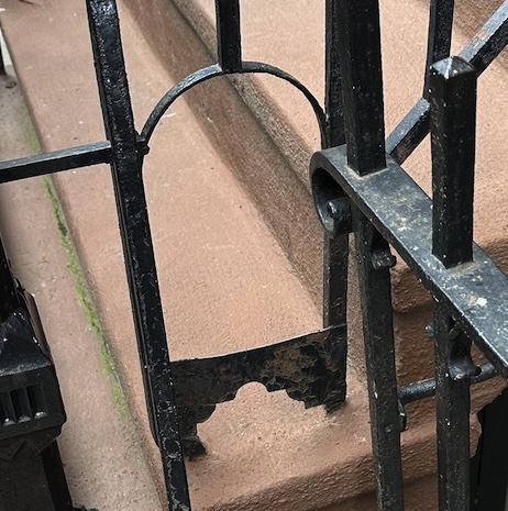For those unfamiliar with the esoterica of stoops: the bootscraper is the piece of wrought-iron plate at the second step up. (Note that you can see an identical scraper on the other side of the stoop. Not every house had two like this.) As for what was being scraped: “mud” was scraped from the soles of your boots or shoes. This makes it time to discuss the language of the past. There are a number of area in and around New York that had or have the name “meadows.” Lispenard Meadows in lower Manhattan (near today’s Canal Street), and the Hackensack Meadows (better known now as the New Jersey Meadowlands) are two examples. One is a former swamp, the other is a former and current swamp. Similarly, in the New York of the 1800s, the mud in the streets had an appreciable percentage of horse manure in it. Scraping it off before you went indoors wasn’t just about keeping your floors clean, it had distinct odor and health implications. This is why boot scrapers were once so common.