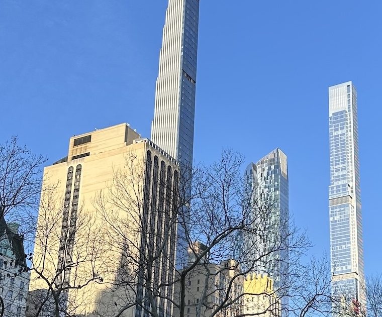 Oh, yeah, with Billionaire’s Row in front of the sky. Central Park is in the foreground, the Plaza Hotel on the far left. There’s a barely visible low building to the right of the Plaza, and then a tallish building with a vertically-striped north facade. That’s the Park Lane Hotel, which is 46 stories high, which I mention only because it puts the size of the Billionaire’s Row buildings in context.