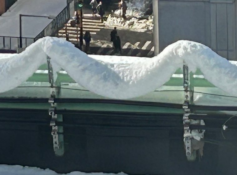 So we’re all clear: this is a narrow setback roof on the building she’s in, facing the street beyond. Her question1 to me, accompanying the photo was “Tensile strength of snow?” Unfortunately, the answer is “meh.”