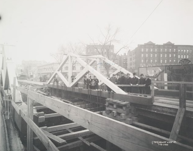 We’re looking north-northwest up Broadway’s diagonal. The two-story building partially hidden by the trusses was at the northeast corner of Broadway and 63rd Street, so the photographer was standing pretty close to the line of 62nd. The focus of the picture, besides the group of men posing, is that beautifully-built wood truss bridge. Except for the fact that the US had moved away from wood-truss bridges some 50 or 60 years earlier, this is pretty enough to be permanent. (I’m not sure if the gleaming white is paint or not. The other wood construction, as can be seen in the foreground, is unpainted, being temporary. The trusses may just be high-grade lumber.) You can see a series of iron hangers off the bottom chord of the middle truss, holding the beams running side to side that make up the basic structure of the temporary street. And you can clearly see the timber grillage that serves as the foundation of the middle trusses end near us.
