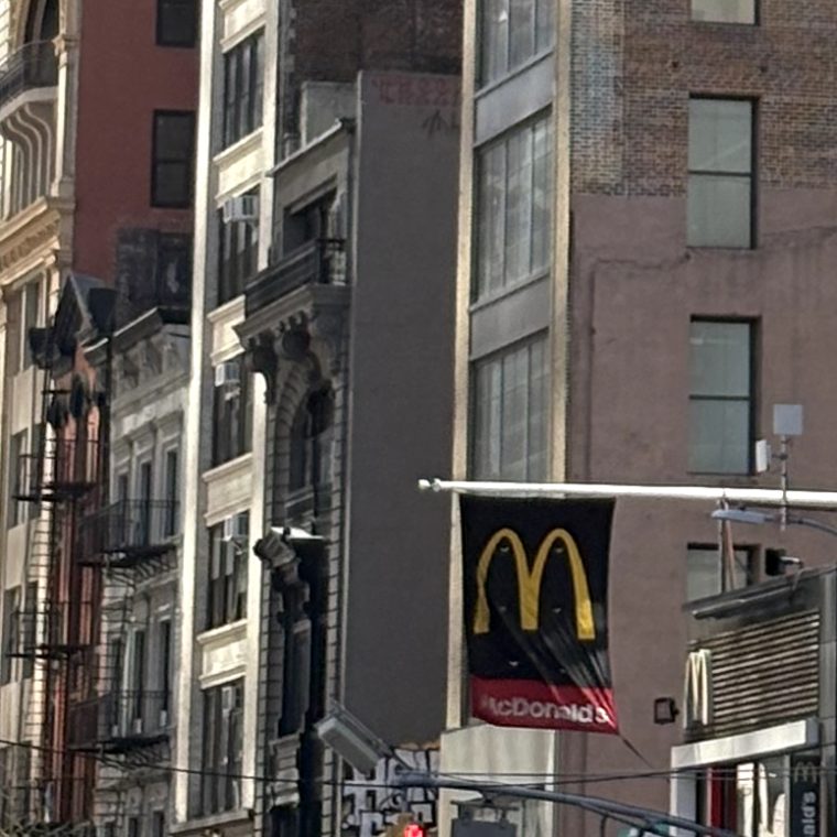 Note the street sign below the McDonald’s flag: Madison Avenue starts (or ends, if you prefer orienting yourself to the south) at 23rd Street and runs off to the left, out of frame. Also off to the left, Madison Square. With one exception – the tallest building on view, the new (2008) glass-facade residential tower to the right of McDonald’s[1] – the whole south side of the street is a series of late-nineteenth- and early-twentieth-century commercial buildings, Most of them are one lot wide, and since the height of those buildings varies widely, you get the sawtooth effect. From the left: tall, medium, short, short, tall, short, very short, tall, very short, very short, very tall, short, medium, short…
