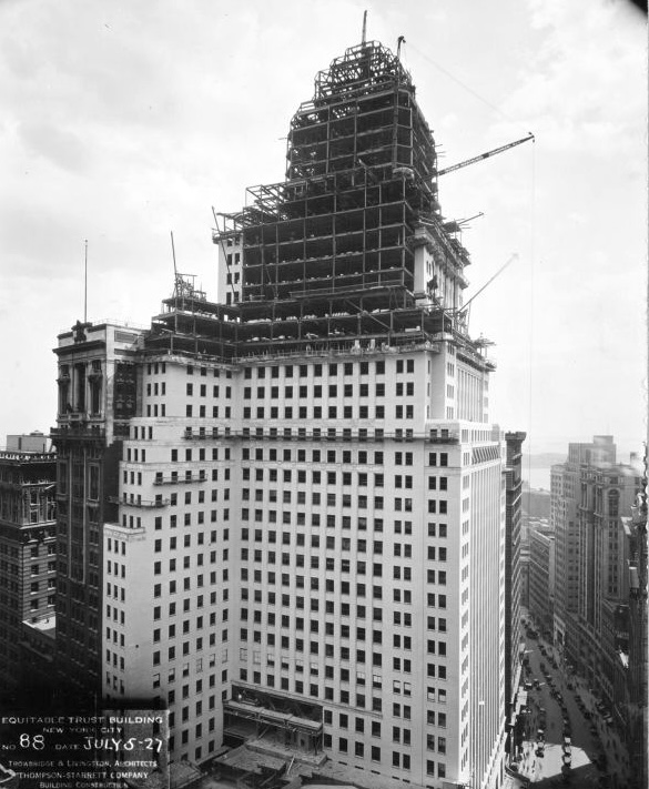 By May 11, the setback at the upper floors were becoming quite clear. Note that the construction of the brick facade had begin on the Broad Street side and a bit on the Wall Street wing.